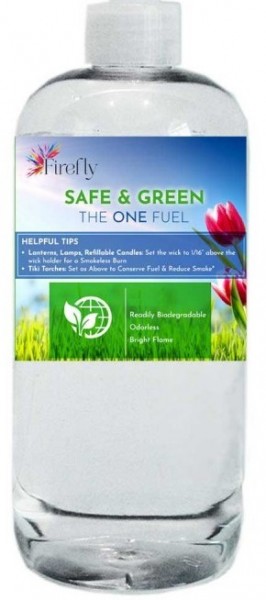 Firefly Safe & Green (No longer available due to exorbitant price and availability) Firefly The One Eco-Friendly Tiki Torch Fuel and Lamp Oil is our newest fuel and by far provides the cleanest and virtually smoke-free flame of any fuel on the market. Our testing demonstrates cleaner wicks, no soot, and can be used in any wicked-powered Tiki Torch, covered or open oil lantern or oil lamp, fire pot, and ventless fireplace with a mat wick. This fuel burns extraordinarily clean with vitally no pollutants. I have saved the best for last. Firefly Safe & Green Fuel is a 100% organic fuel that is fully sustainable. There is NO Ethanol or Petroleum used in Safe and Green fuel!